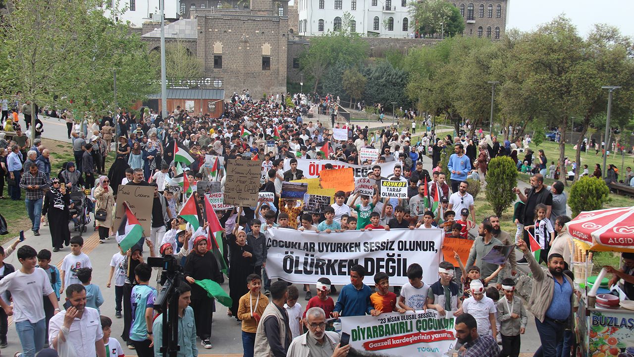 Diyarbakır merkez Sur ilçesi Hazreti Süleyman yerleşkesinde bir araya gelen ilkokul ve ortaokul öğrencileri, ellerindeki döviz ve pankartlarla Gazze'ye destek mesajları içeren sloganlar getirerek tarihi Kurşunlu Camii'ne doğru yürüyüşe geçti.