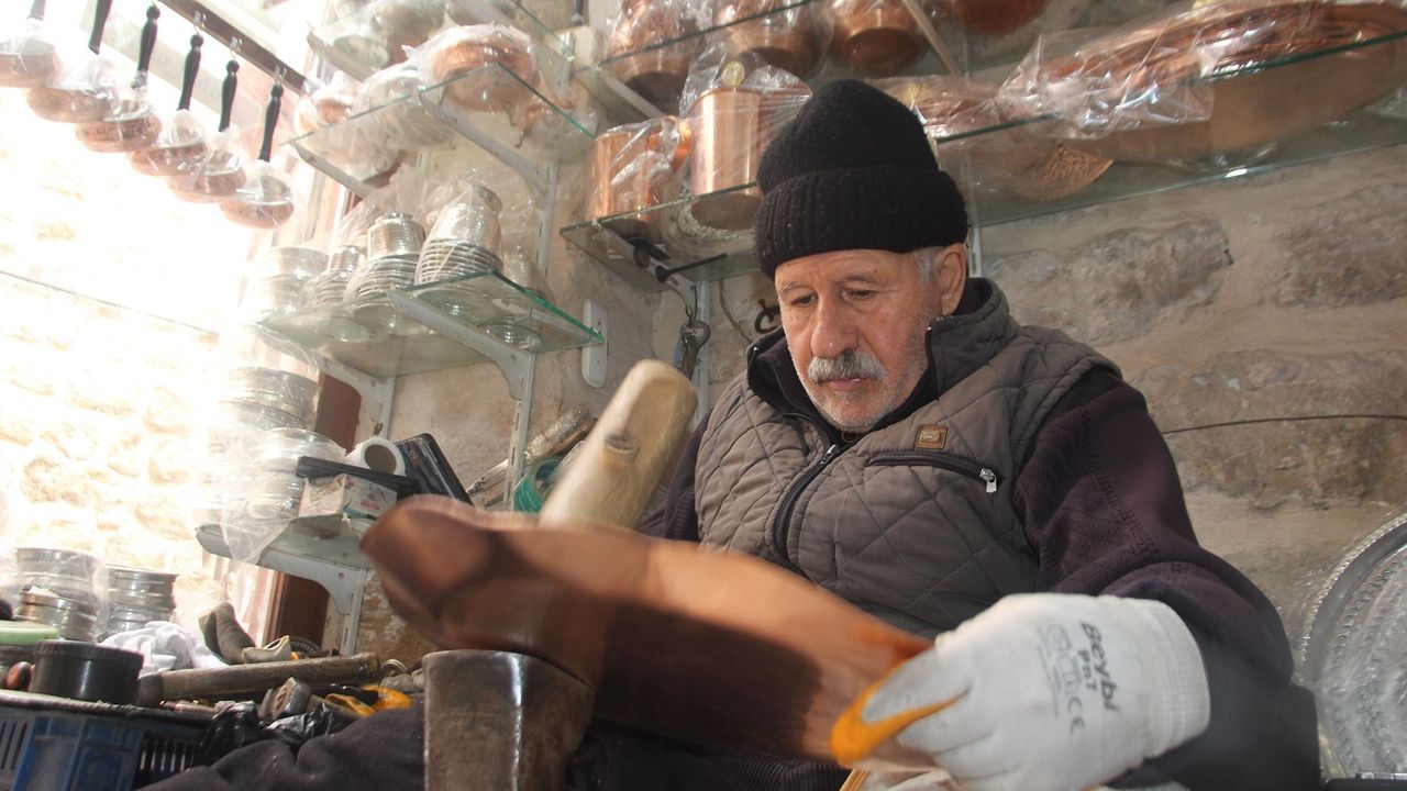 Mardin Bakırcılar Çarşısı’nda henüz 10 yaşındayken babasının yanında çırak olarak çalışmaya başlayan Nihat Özcan, yarım asrı aşkın süredir mesleğini sürdürmeye çalışıyor.