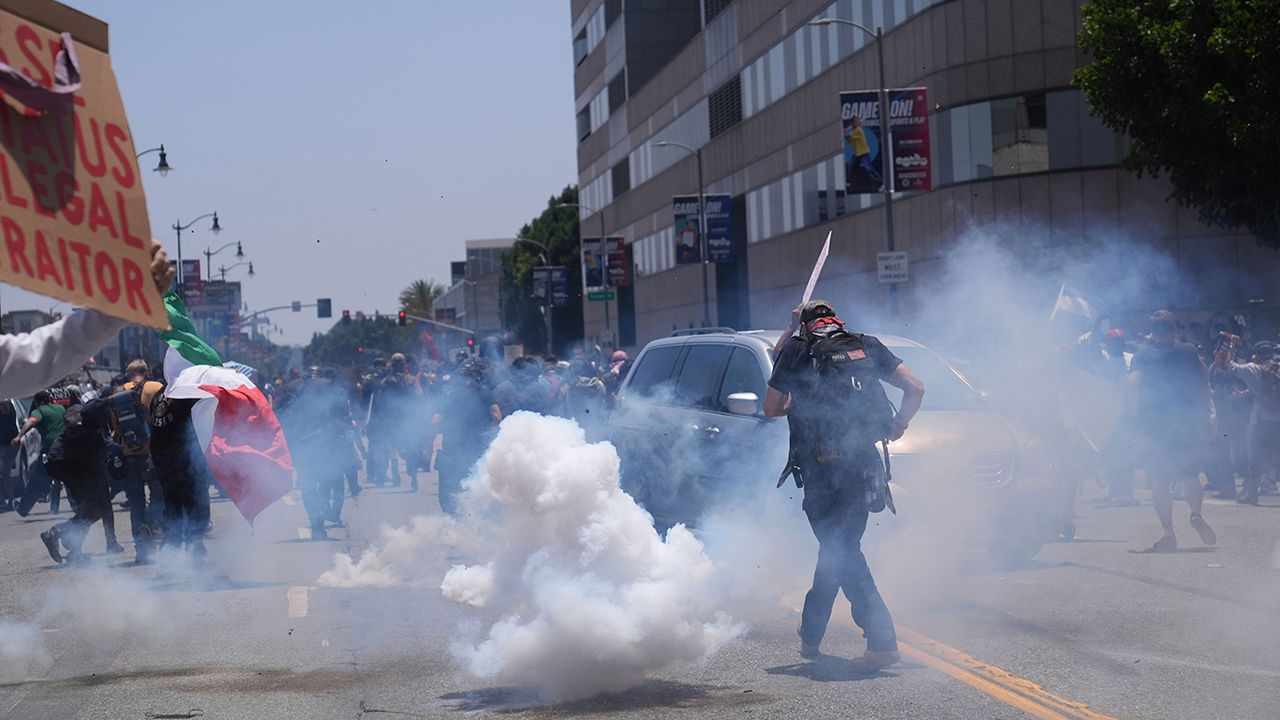 Kamarillo’daki tarım arazisinde yüzlerce kişi toprak yollar üzerinde toplandı. İşçiler ve aileleri, güvenlik güçlerinin müdahalesine tepki gösterdi.