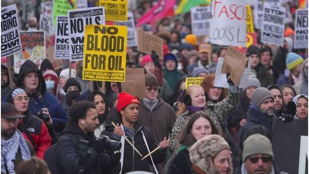 Göstericiler, Manhattan’da Times Meydanı’ndan Columbus Circle’a kadar yürüyüş yaparak ABD’nin Venezuela’ya yönelik müdahalesini protesto etti.