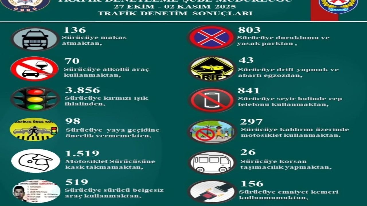 Denetimlerde 3 bin 856 sürücüye kırmızı ışık ihlali, 1519 motosiklet sürücüsüne kask takmamak, 841 sürücüye seyir halindeyken cep telefonu kullanmak, 803 sürücüye duraklama ve yasak park ihlali nedeniyle cezai işlem uygulandı.