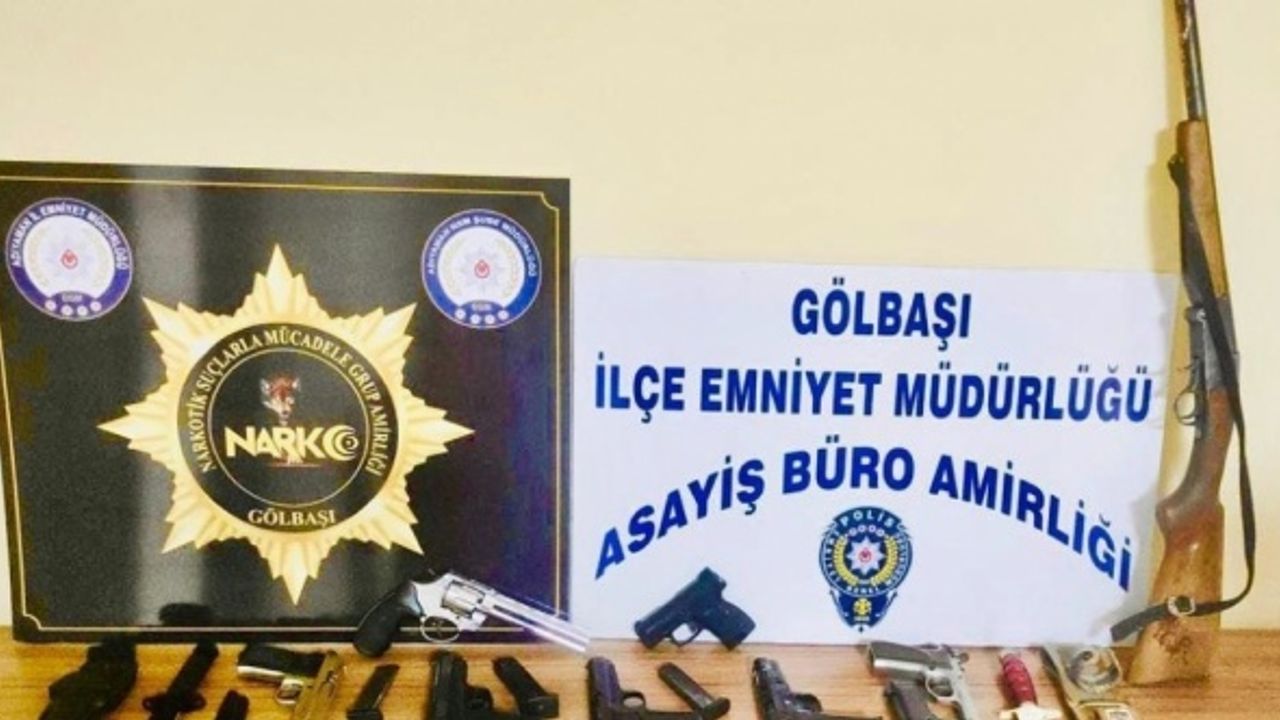 Gölbaşı İlçe Emniyet Müdürlüğü Narkotik Suçlarla Mücadele Grup Amirliği ekiplerince, H.B'ye ait araçta ve iş yerinde yapılan aramada, kurusıkıdan bozma 3 tabanca, 3 kurusıkı tabanca ve 1 av tüfeği ile bu silahlara ait 106 mermi ve bıçaklar ele geçirildi.
