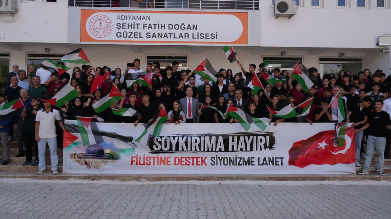 Şehit Fatih Doğan Güzel Sanatlar Lisesi öğretmen ve öğrencileri de okul bahçesinde bir araya gelerek, ellerinde "Soykırıma Hayır! Filistin’e Destek, Siyonizme Lanet" yazılı afişlerle Filistin temalı şarkılar eşliğinde farkındalık etkinliği düzenledi.