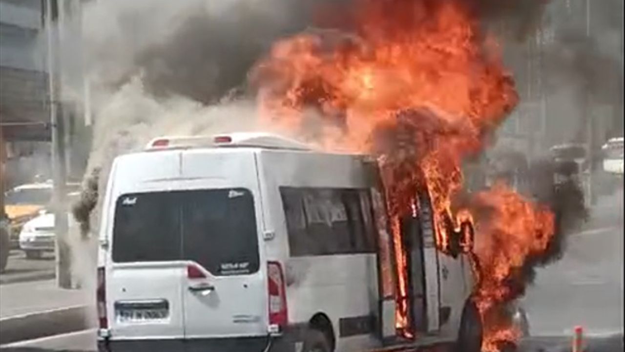 Aracın motor kısmından dumanların yükselmesi üzerine yolcuların tahliye edildiği dolmuş aracı aniden alevlere teslim oldu.