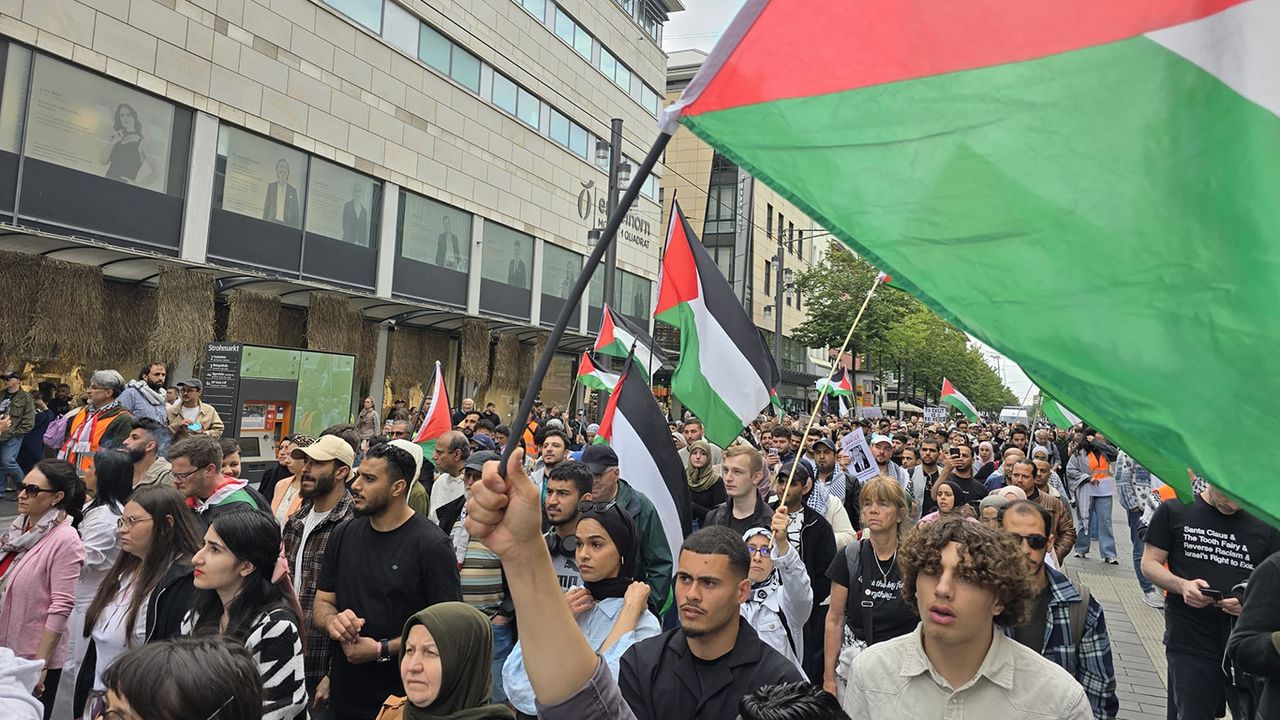 Gösteriye katılanlar, "Çocuk katili israil, bebek katili israil", "Netenyahu sabıkalı, Boykot israil, katliamı ve işgali hemen durdurun" "Biz adalet istiyoruz, işgali hemen durdurun", "Baskılara boyun eğmeyeceğiz" "Almanya soykırım ortağıdır",