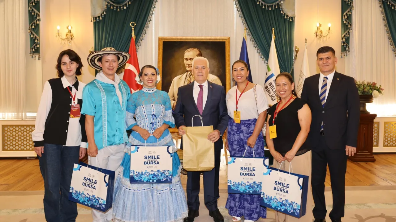Bursa Büyükşehir Belediyesi tarafından bu yıl 37’ncisi düzenlenen Uluslararası Altın Karagöz Halk Dansları Yarışması’na katılan ekiplerin temsilcileri, Başkan Mustafa Bozbey’i ziyaret ederek ülkelerinin sembol hediyelerini sundu.BURSA (İGFA) - Bursa Büyükşehir Belediyesi adına Bursa Kültür Sanat ve Turizm Vakfı (BKSTV) tarafından düzenlenen 37. Uluslararası Altın Karagöz Halk Dansları Yarışması'na katılan ülkelerin temsilcileri ve yarışmanın jüri üyeleri, Bursa Büyükşehir Belediye Başkanı Mustafa Bozbey’i Tarihi Belediye Binası’nda ziyaret etti.