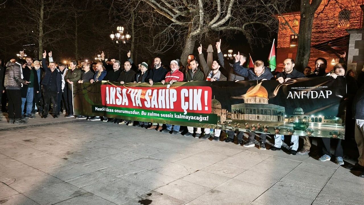 Ankara’da Hacı Bayram Camii avlusunda teravih namazı sonrası toplanan Ankara Filistin Dayanışma Platformu (ANFİDAP), işgalci siyonistlerin Mescid-i Aksa’yı ibadete kapatmasına tepki gösterdi. Platform adına basın açıklamasını okuyan İHH Ankara Şube Başkanı Hacı Bayram Şahin, Aksa’nın 18 gündür Müslümanlara kapalı tutulduğunu belirterek, bu uygulamanın uluslararası hukuka ve temel insan haklarına aykırı olduğunu ifade etti.