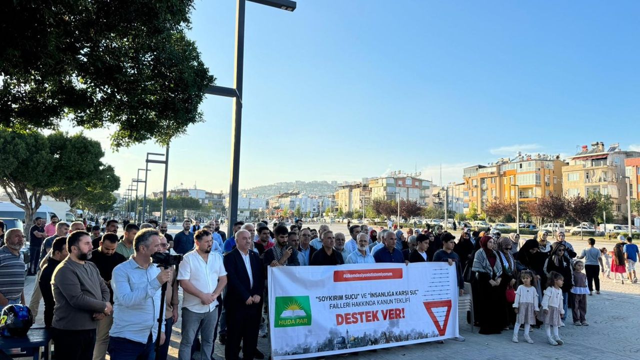 Ardından HÜDA PAR İl Sekreteri Abdurrezzak Çelik, parti adına hazırlanan basın metnini okuyarak, işgal rejiminin Filistin’de sürdürdüğü saldırıların “açık bir soykırım” olduğunu vurguladı.