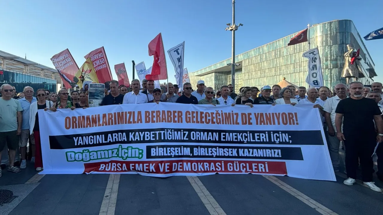 Bursa Emek Demokrasi Güçleri, artan orman yangınları ve yangınla mücadele eden personelin yaşadığı zorluklara dikkat çekmek amacıyla basın açıklaması yaptı. Açıklamaya, CHP Bursa İl Başkanlığı da destek verdi.Adiviye ELBAŞ - gazeteabc / BURSA (İGFA) - Bursa Emek Demokrasi Güçleri'nin gerçekleştirdiği ve CHP Bursa İl Başkanlığı'nın da destek verdiği basın açıklamasında, Tarım Orkamsen Şube Başkanı Tarık Efe, Türkiye’nin orman yangınlarına dair çarpıcı veriler paylaştı.