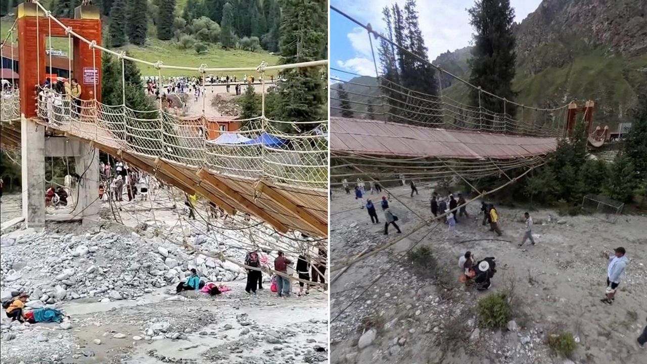 Halat koptuktan sonra köprünün bir tarafa doğru eğildiği, bazı kişilerin köprünün asılı tarafına tutunarak güvenli bir şekilde kıyıya geçmeyi başardı.