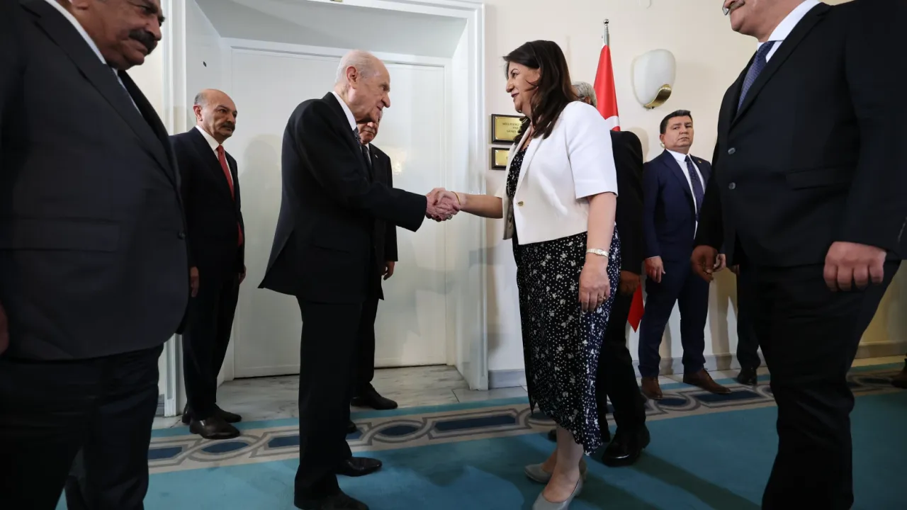 MHP Genel Başkanı Devlet Bahçeli, TBMM Başkanvekili ve DEM Parti Van Milletvekili Pervin Buldan ile beraberindeki DEM Parti heyetini kabul etti.ANKARA (İGFA) - MHP Genel Başkanı Devlet Bahçeli'nin Meclis'teki makamında gerçekleşen görüşmede, TBMM Başkanvekili Celal Adan ve MHP İstanbul Milletvekili Feti Yıldız da yer aldı.