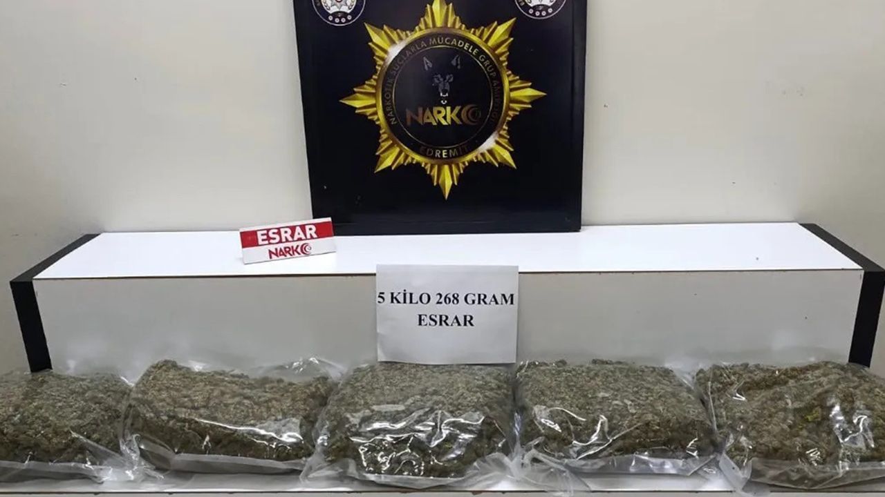 Evde yapılan aramalarda 5 kilogram esrar maddesi ele geçirildi.