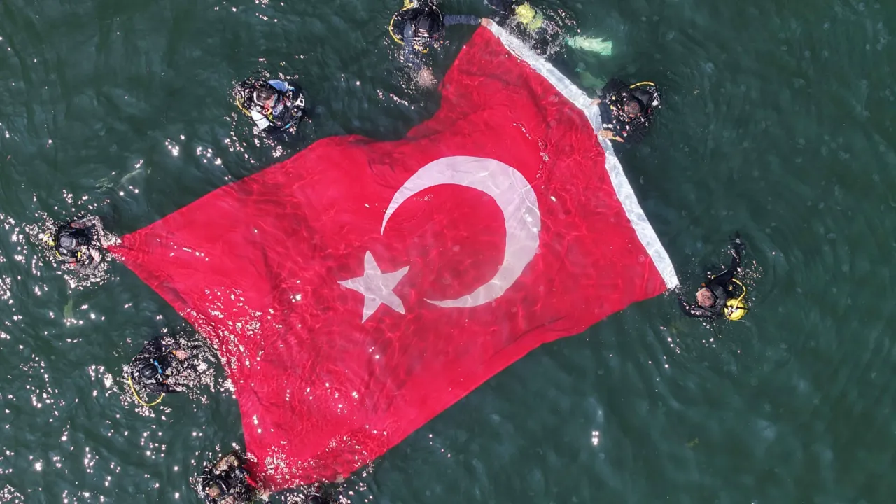 Daha sonra dalgıçlar su altındaki dev Türk Bayrağı’nı çıkararak protokolü selamladı.
