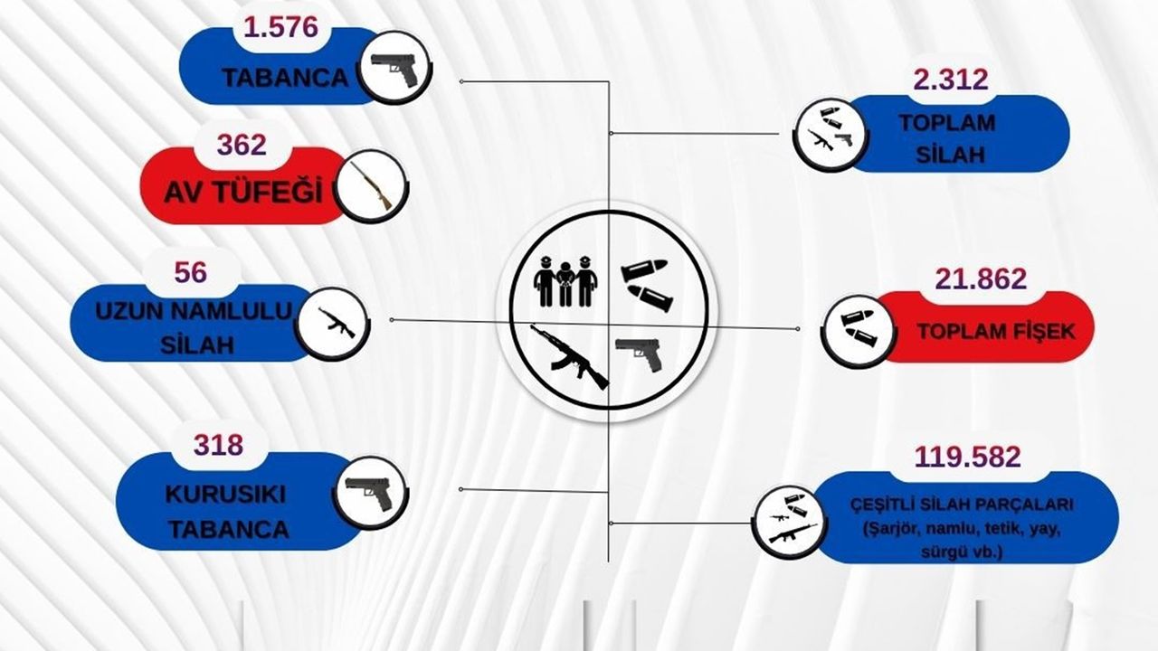 Emniyet müdürlüğü verilerine göre, söz konusu üç yıllık süreçte bin 576 tabanca, 362 av tüfeği, 56 uzun namlulu silah, 318 kurusıkı tabanca olmak üzere, toplam 2 bin 312 silah muhafaza altına alındı. Ayrıca 21 bin 862 fişek ve 119 bin 582 çeşitli silah parçası ele geçirildi.