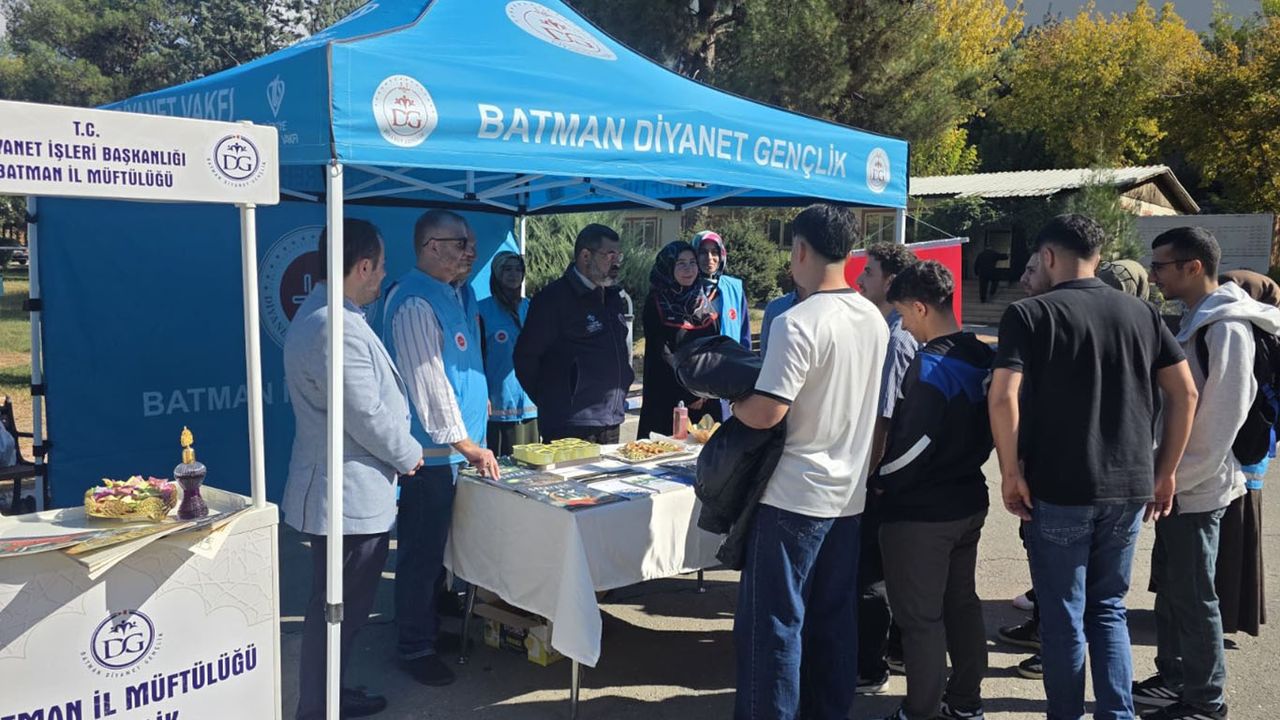 Batman İl Müftüsü Ahmet Durmuş ile Müftü Yardımcısı Halime Esra Özdemir, tanıtım standını ziyaret ederek çalışmaları yerinde inceledi ve üniversiteli gençlerle sohbet etti.