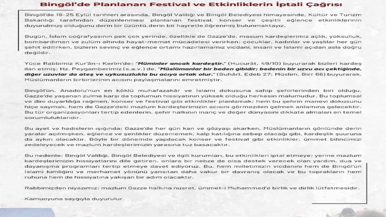 “Bingöl’de 19-25 Eylül tarihleri arasında, Bingöl Valiliği ve Bingöl Belediyesi himayesinde, Kültür ve Turizm Bakanlığı tarafından düzenlenmesi planlanan festival, konser ve çeşitli eğlence etkinliklerinin duyurulmuş olduğunu derin bir üzüntü, derin bir hayretle öğrenmiş bulunmaktayız. Bugün, İslam coğrafyasının pek çok yerinde, özellikle de Gazze’de, masum kardeşlerimiz açlık, yoksulluk, bombardıman ve zulüm altında hayat-memat mücadelesi verirken; çocuklar, kadınlar ve yaşlılar her gün şehit edilirken, bizlerin sevinç ve eğlence ortamı hazırlamamız vicdani, insani ve İslami açıdan asla doğru değildir. Yüce Rabbimiz Kur’ân-ı Kerim’de: “Müminler ancak kardeştir.” (Hucurât, 49/10) buyurarak bizleri kardeş ilan etmiş; Hz. Peygamberimiz (Sallallahu Aleyhi Vesellem) de: “Müslümanlar bir beden gibidir; bedenin bir uzvu acı çektiğinde, diğer uzuvlar da ateş ve uykusuzlukla bu acıya ortak olur.” (Buhâri, Edeb 27; Müslim, Birr 66) buyurarak Müslümanların birbirlerinin acısını paylaşmalarını emretmiştir. Bingöl’ün, Anadolu’nun en köklü muhafazakâr ve İslami dokusuna sahip şehirlerinden biri olduğu, Gazze’de yaşanan zulme karşı da toplumun hissiyatının yüksek olduğu herkesin malumudur. Bu toplumsal ve dini duyarlılığa rağmen, konser ve festival gibi etkinlikler planlamak; hem bu şehrin manevi dokusunu hiçe saymak, hem de Gazze’deki mazlum kardeşlerimizin acısını görmezden gelmek anlamına gelecektir. Bu tür organizasyonları tertip edenlerin, şehir halkının inanç ve değer dünyasını dikkate almaları en temel sorumluluklarıdır. Bu ayet ve hadislerin ışığında; Gazze’de her gün kan ve gözyaşı akarken, Müslümanların gönlünde derin yaralar açılmışken, eğlence ve şenlikler düzenlemek, alınganlığa sebep olacağı gibi, kardeşlik şuuruna da aykırı olacaktır. Böyle bir dönemde yapılacak konser ve festival gibi etkinlikler, ümmet bilincimizi zedeleyecek ve mazlum kardeşlerimizin yarasına tuz basacaktır. Bundan dolayı; Bingöl Valiliği, Bingöl Belediyesi ve ilgili kurumları, bu etkinlikleri iptal etmeye; yerine mazlum kardeşlerimizin hissiyatlarını dile getiren, onlara bir nebze de olsa destek verecek olan yardım, dua ve dayanışma programları tertip etmeye davet ediyoruz. Bu, hem milletimizin vicdanını hem de Bingöl’ün İslami kimliğini ve merhamet yönünü yansıtan daha vakur bir davranış olacak ve bu toprakların hem ruhuna hem de hissiyatına yakışan bir adım olacaktır. Rabbimizden niyazımız; mazlum Gazze halkına nusret, ümmet-i Muhammed’e birlik ve dirlik lütfetmesidir. Kamuoyuna saygıyla duyurulur.” (İLKHA)