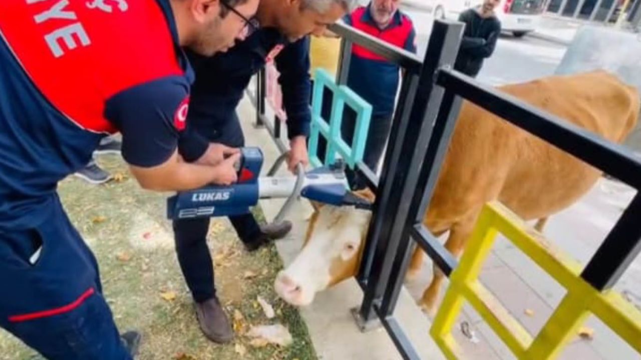 Sahibi tarafından otlatılmak üzere dışarı çıkarılan inek, henüz belirlenemeyen bir nedenle demir korkuluklar arasına sıkıştı.