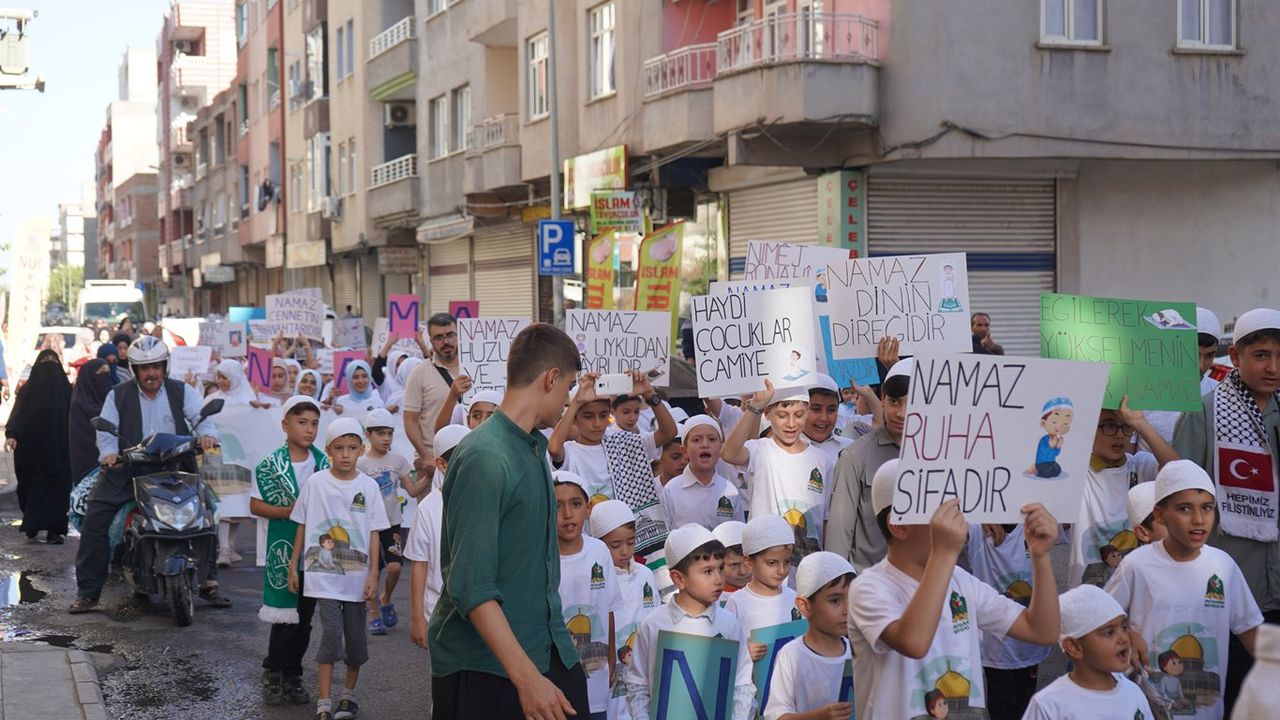 Ellerinde “Hayat Namazla Güzeldir” pankartları ile yürüyen çocuklar sık sık “Hayat namazla güzeldir”, “baba beni camiye götür”, “namaz dinin direğidir”, “namaz ruhun gıdasıdır” sloganları atarak tekbirler ve salavatlar eşliğinde etkinliğin yapılacağı alana kadar yürüdüler.