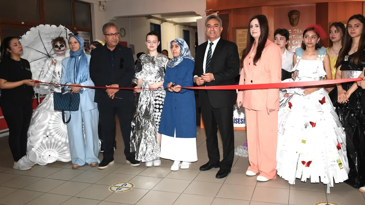 Osmangazi Belediyesi İklim Değişikliği ve Sıfır Atık Müdürlüğü tarafından düzenlenen seminer sonunda öğrenciler, kullanılmış karton tabak ve bardak, giyilmiş gelinlik, atık perde, çöp poşetleri, ders notu kağıtları gibi geri dönüşüm malzemelerinden yapmış oldukları kıyafetler ve el işi ürünler ile geri dönüşümün önemine dikkat çekti.