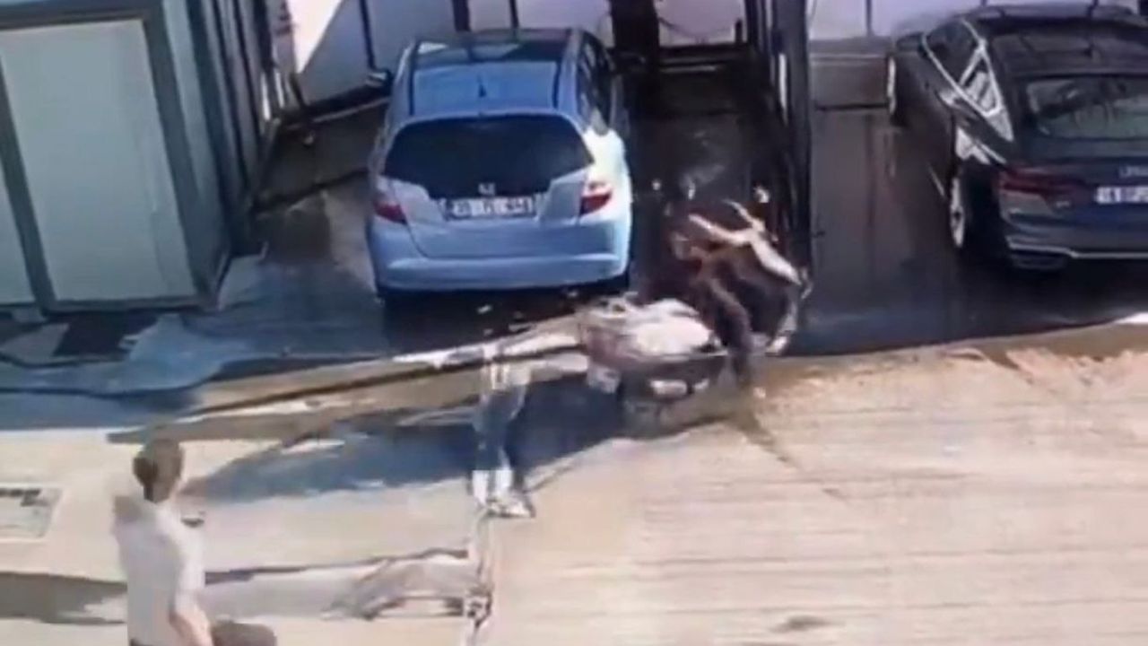 Ancak sürücünün bir anda gaza yüklenmesiyle motosiklet kontrolden çıkarak hızla istasyonun araç yıkama bölümüne yöneldi ve burada yıkanmakta olan 16 BFJ 637 plakalı otomobile çarptı.