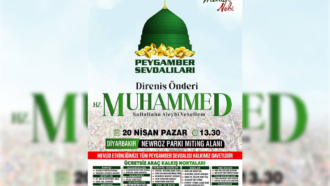 Diyarbakır'da yapılması planlanan etkinlik ve temayla ilgili bilgi veren Kaya, "Nevruz Park miting alanında Pazar günü saat 13.30'da yapılacak olan bütün halkımız tarafından özlemle beklendiği, dua ve salavatlarla eşlik edildiği Mevlid-i Nebi programına tüm Diyarbakır halkını davet ediyorum. Her yıl Peygamber Efendimizin bir yönünün ele alındığı programlarda bu yıl Mevlid etkinliği için belirlenen tema 'Direniş Rehberi Hazreti Muhammed Sallallahu Aleyhi Vesellem'dir. Halkımızın özlemle beklediği bu programa inşallah yoğun bir şekilde katılımlarını bekliyoruz." ifadelerini kullandı.