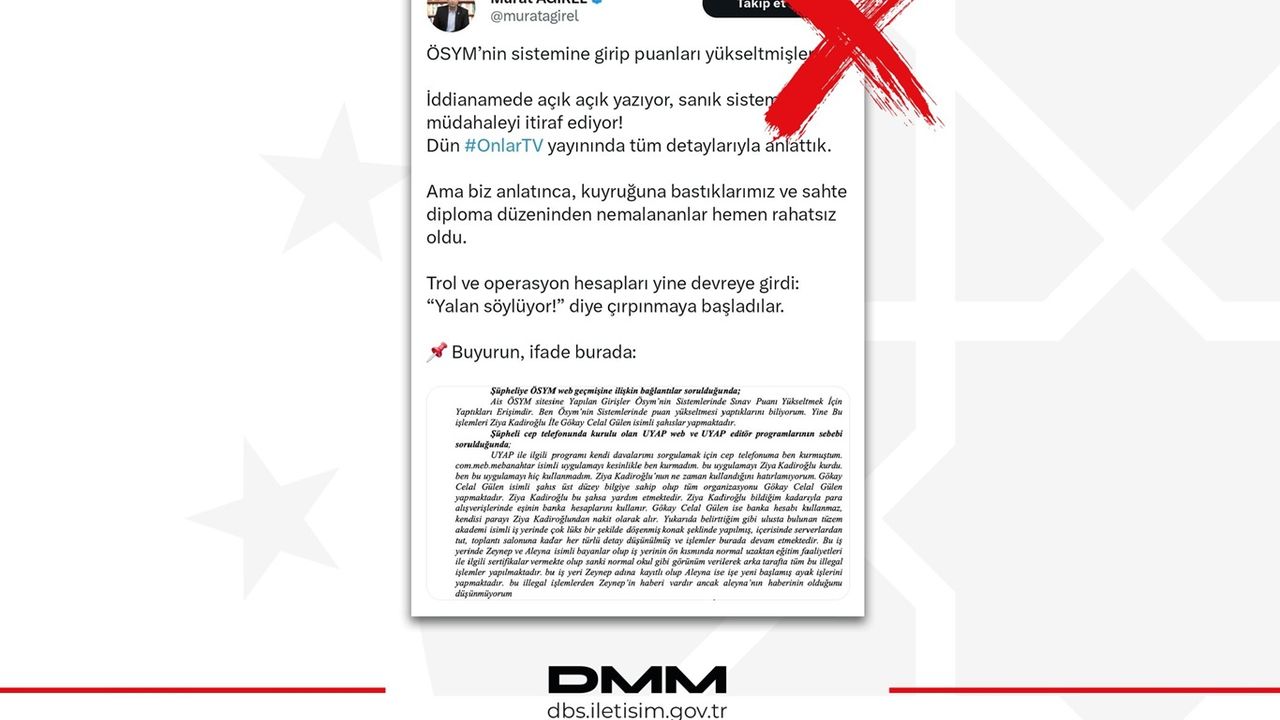Dezenformasyonla Mücadele Merkezi (DMM), bazı basın yayın organlarında yer alan "ÖSYM’nin sistemine girilerek adayların puanlarının değiştirildiği" yönündeki iddiaların gerçeği yansıtmadığını belirterek, bu tür içeriklerin kamuoyunu yanıltmaya yönelik açık bir dezenformasyon olduğunu açıkladı.