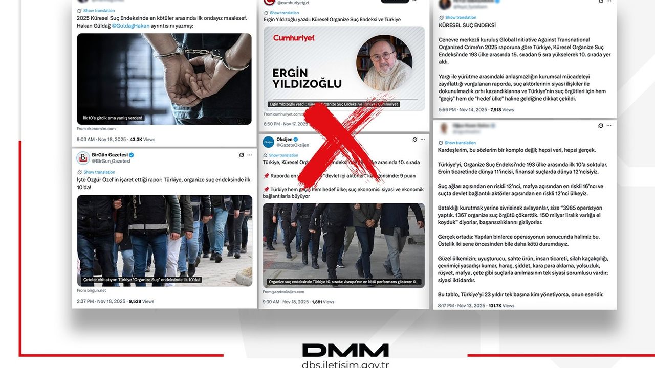 DMM'den yapılan açıklamada, bazı haberlerde ve sosyal medya paylaşımlarında, sözde “Küresel Organize Suç Endeksi Raporu”nda Türkiye’nin 193 ülke arasında suçta 10’uncu sırada yer aldığı ve dayanıklılık sıralamasında 131’inci sıraya düştüğü şeklinde iddiaların dolaşıma sokulduğu belirtildi.