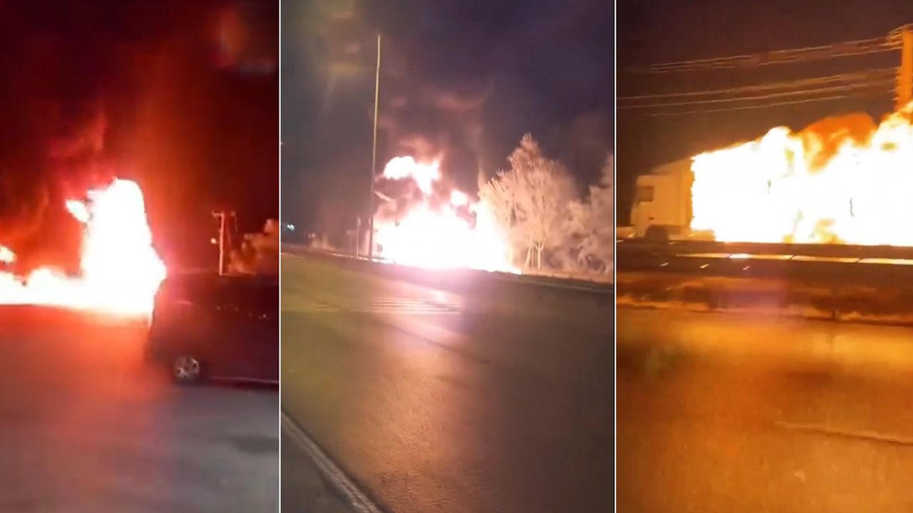 Yangın sırasında kimyasal maddeler ve boya malzemeleri yola saçıldı, alevler yol kenarındaki ağaçlara da sıçradı.