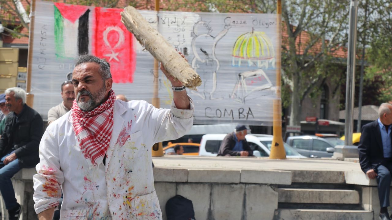 Artvin Çoruh Üniversitesi Görsel İletişim Tasarımı Bölümü Öğretim Üyesi Dr. Kemal Sağlam, Ankara'nın Ulus Meydanında Gazze'deki soykırıma dikkat çekmek amacıyla tek kişilik bir eylem gerçekleştirdi.