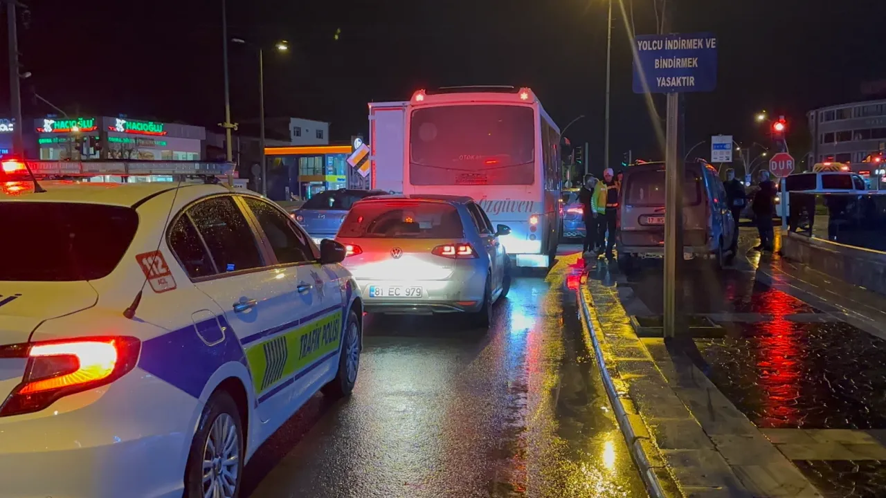 Düzce’de kırmızı ışıkta bekleyen otomobile çarpan alkollü olduğu iddia edilen minibüs sürücüsü, kaçmaya çalışırken polis tarafından yakalandı.Sefer DEMİR / DÜZCE (İGFA) - Düzce merkez Kuyumcuzade Bulvarı Öztürkler Işıklı kavşağı girişinde kırmızı ışıkta bekleyen Osman K. idaresindeki 81 FC 050 plakalı otomobile aynı istikamette gelen sürücünün ismi öğrenilemeyen 81 FH 009 plakalı servis minibüsü çarptı.