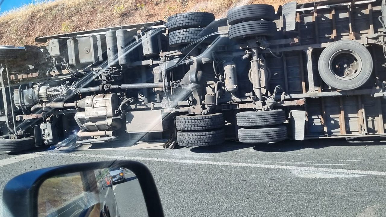 Edinilen bilgilere göre, sürücüsünün direksiyon hâkimiyetini kaybetmesi sonucu kontrolden çıkan tır, karayoluna devrildi.