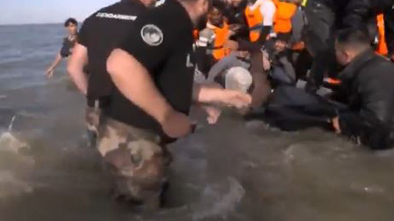 Görüntülerde, bot henüz sığ sulardayken bir polis memurunun, şişme botun kauçuğunu deldiği görülüyor.