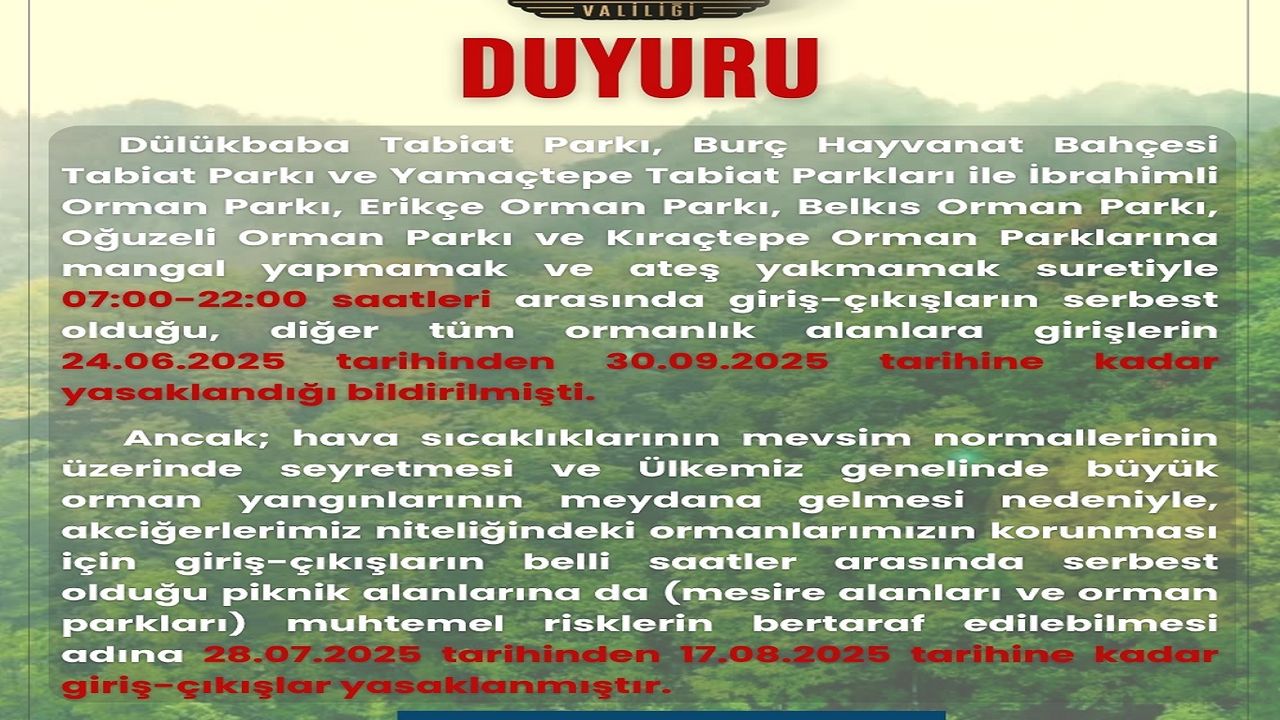 Valilikten yapılan açıklmada, "Dülükbaba Tabiat Parkı, Burç Hayvanat Bahçesi Tabiat Parkı ve Yamaçtepe Tabiat Parkları ile İbrahimli Orman Parkı, Erikçe Orman Parkı, Belkıs Orman Parkı, Oğuzeli Orman Parkı ve Kıraçtepe Orman Parklarına mangal yapmamak ve ateş yakmamak suretiyle 07.00–22.00 saatleri arasında giriş-çıkışların serbest olduğu, diğer tüm ormanlık alanlara girişlerin 24 Haziran 2025 tarihinden 30 Eylül 2025 tarihine kadar yasaklandığı bildirilmişti." ifadeleri kullanıldı.