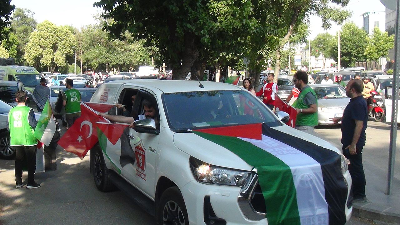 Araçlarını tevhit ve Filistin bayraklarıyla donatan vatandaşlar, Filistin için bir şeyler yapmış olmanın verdiği sevinci yaşadı. (İLKHA)