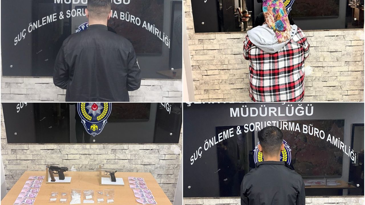 Operasyonda 1 adet ruhsatsız tabanca, 1 adet kurusıkı tabanca ve 78 gram metamfetamin ele geçirildi.