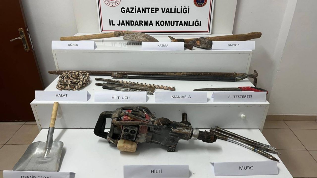 Şüphelilerin kazı faaliyetlerinde kullandıkları; 5 adet kazı malzemesi, 1 adet hilti, 2 adet levye demiri, 1 adet balyoz, 1 adet el testeresi, 3 adet murç, 6 adet matkap ucu ve 3 metre halat ele geçirildi.