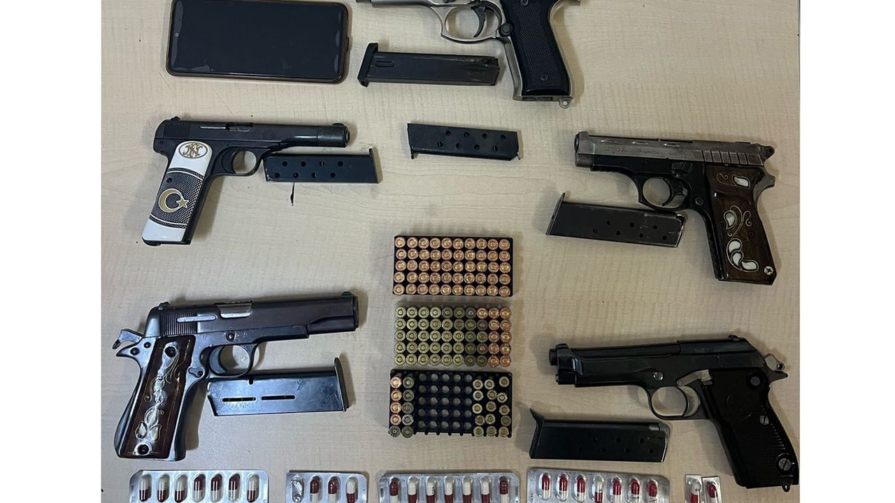 Emniyetten yapılan açıklamada, 5 adet ruhsatsız tabanca, 6 adet şarjör, 125 adet fişek, 75,86 gram metamfetamin, 54 adet uyuşturucu hap ele geçirildiği ifade edildi.