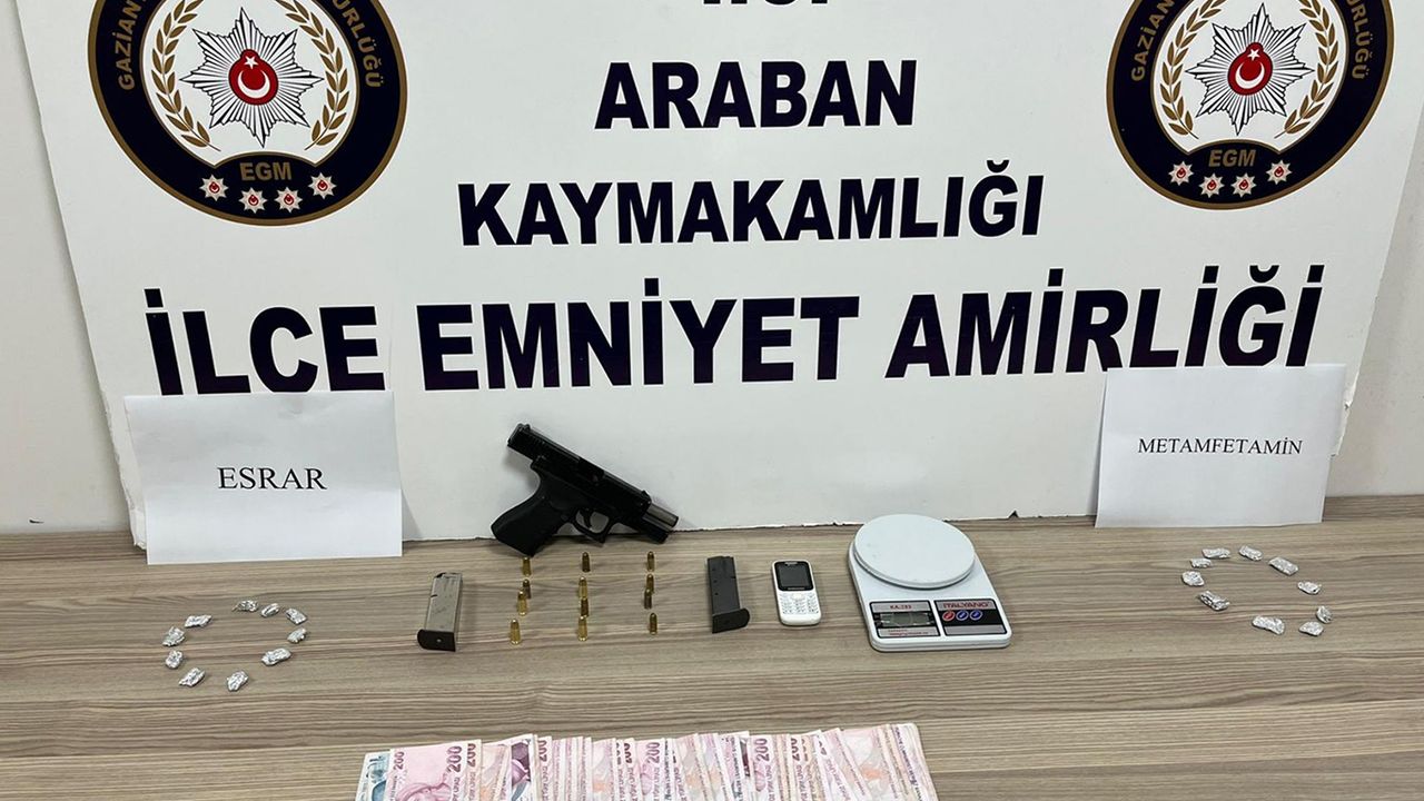 Gaziantep İl Emniyet Müdürlüğü tarafından yapılan açıklamada, "Araban İlçe Emniyet Amirliği ekiplerimizce yapılan çalışmalarda; 1 adet ruhsatsız tabanca,12 adet fişek,