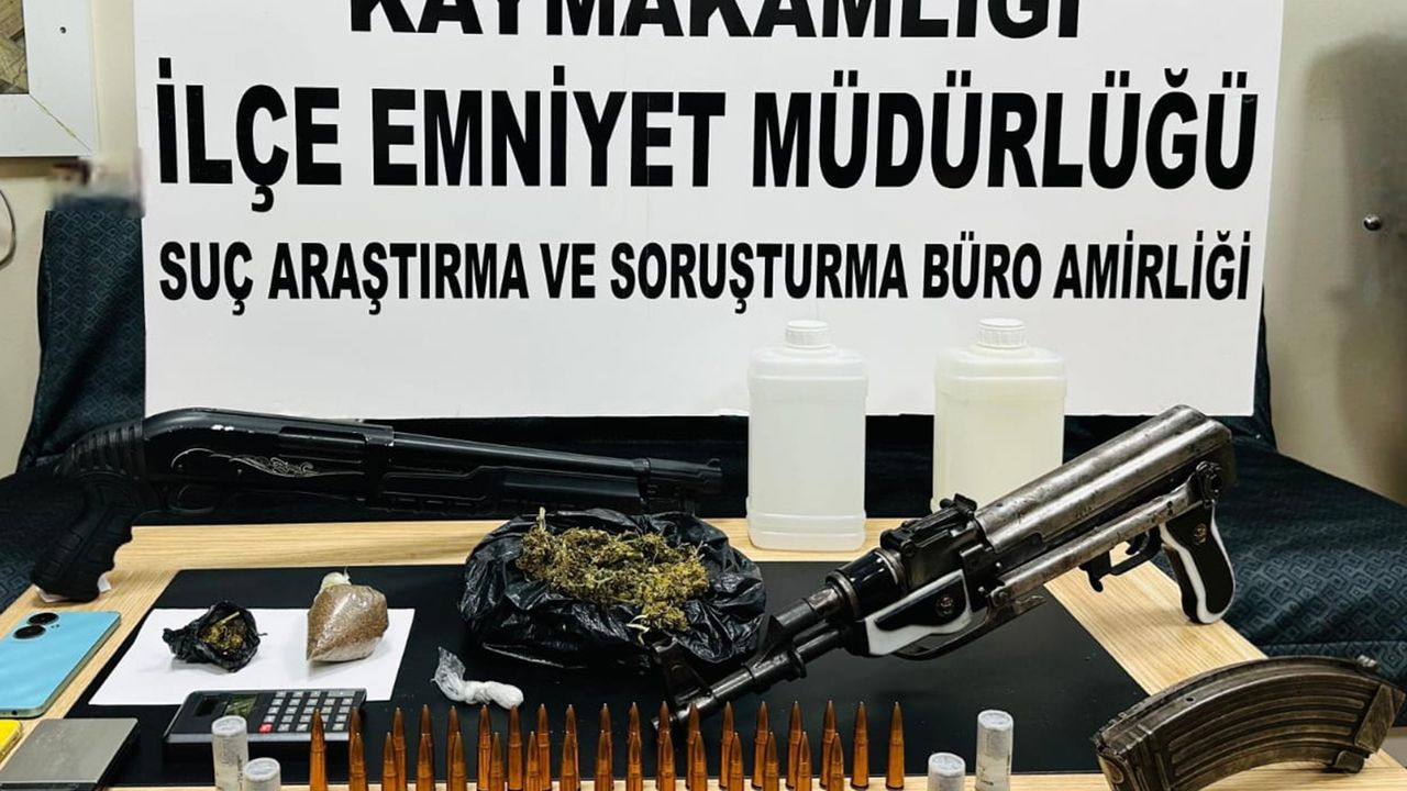 Operasyonda bir adet AK-47 kalaşnikof tüfek, bir adet pompalı tüfek, kırk iki adet fişek, bir buçuk litreye yakın sentetik kannabinoid sıvısı, seksen yedi gram skunk, otuz bir gram A-4 uyuşturucu madde ve bir adet hassas terazi bulundu.