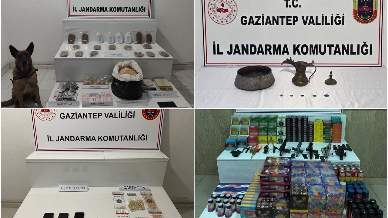 Gaziantep İl Jandarma Komutanlığı ekiplerince, Cumhuriyet Başsavcılığı koordinesinde gerçekleştirilen operasyonlarda; 9 bin 443 adet uyuşturucu hap, 112 gram metamfetamin, 23 kilo 995 gram esrar, 8 kilo 100 gram skunk, 22 kilo uyuşturucu yapımında kullanılan kimyasal madde ve 27 adet uyuşturucu kullanma aparatı ele geçirildi.