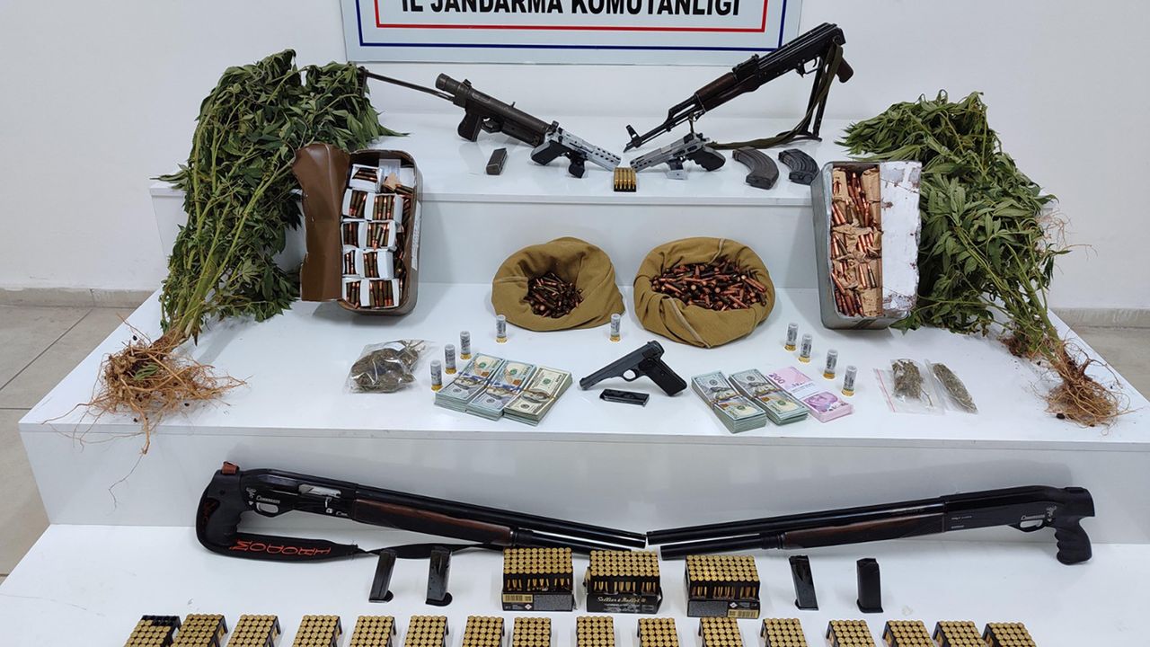 24 adet şarjör, 1 adet kalaşnikof, 48 bin ABD doları suç geliri para, 21 bin 200 lira suç geliri para ele geçirildi.
