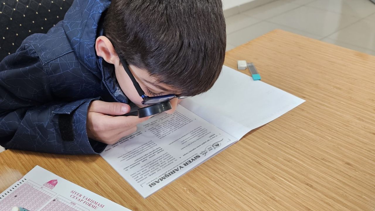 Sınav esnasında Ak, elindeki mercek yardımıyla soruları okumaya çalıştı.