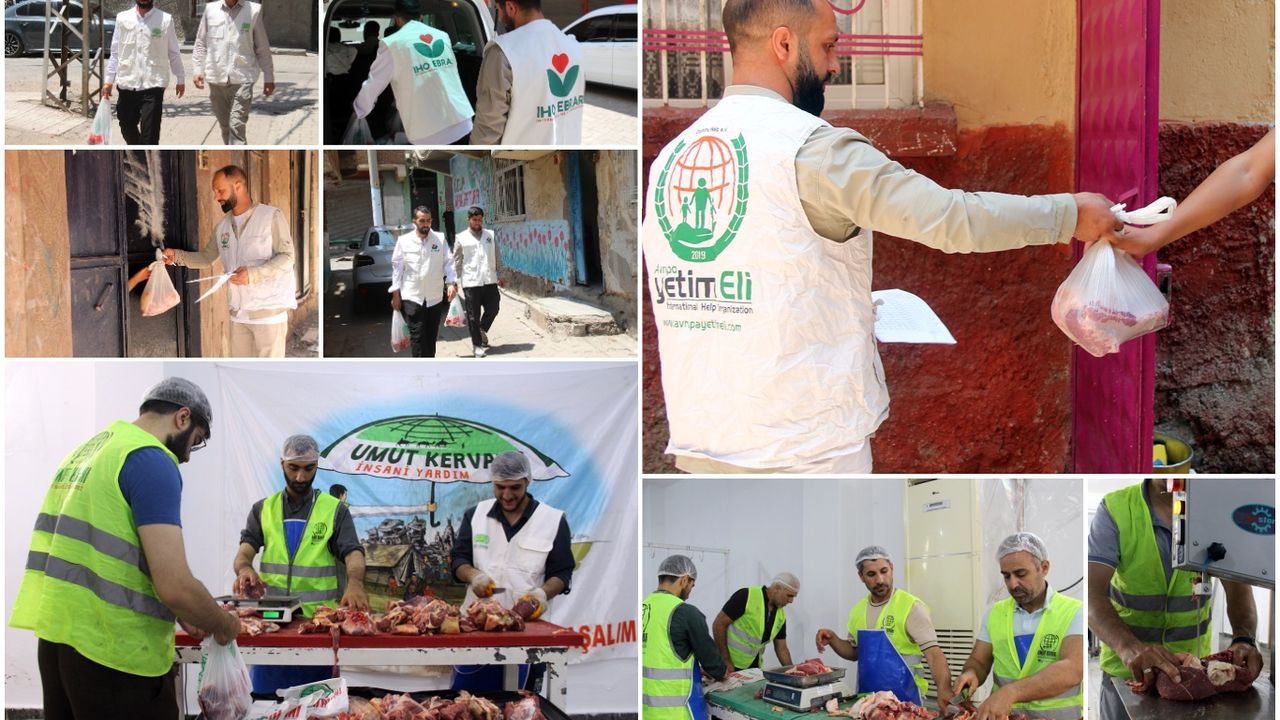 Kurban Bayramının 2'nci gününde kurbanlıkları kestikten sonra dinlenmeye bırakan yardım kuruluşları Umut Kervanı, Yetimler Vakfı, Avrupa Yetim Eli ve IHO EBRAR, bugün sabahın ilk ışıklarıyla beraber parçalama ve ardından muhtaç ailelere dağıtım faaliyetine başladı.