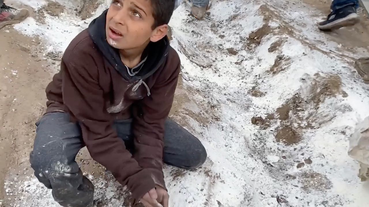 Gazze'nin güneyindeki Han Yunus kentinde halk, yere saçılan unları toplayarak temel gıda temin etmeye çalışıyor.