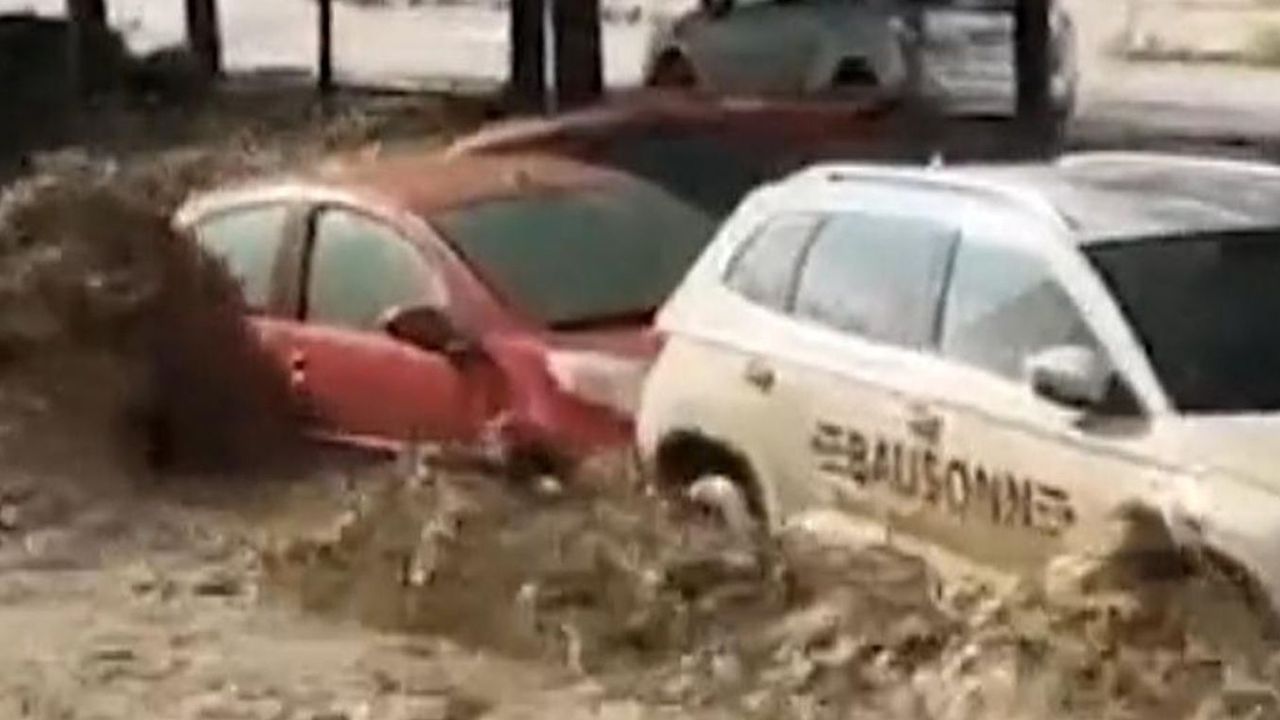 Sel nedeniyle cadde ve sokaklar sular altına kalırken, araçlar sel suları içinde sürüklendi.