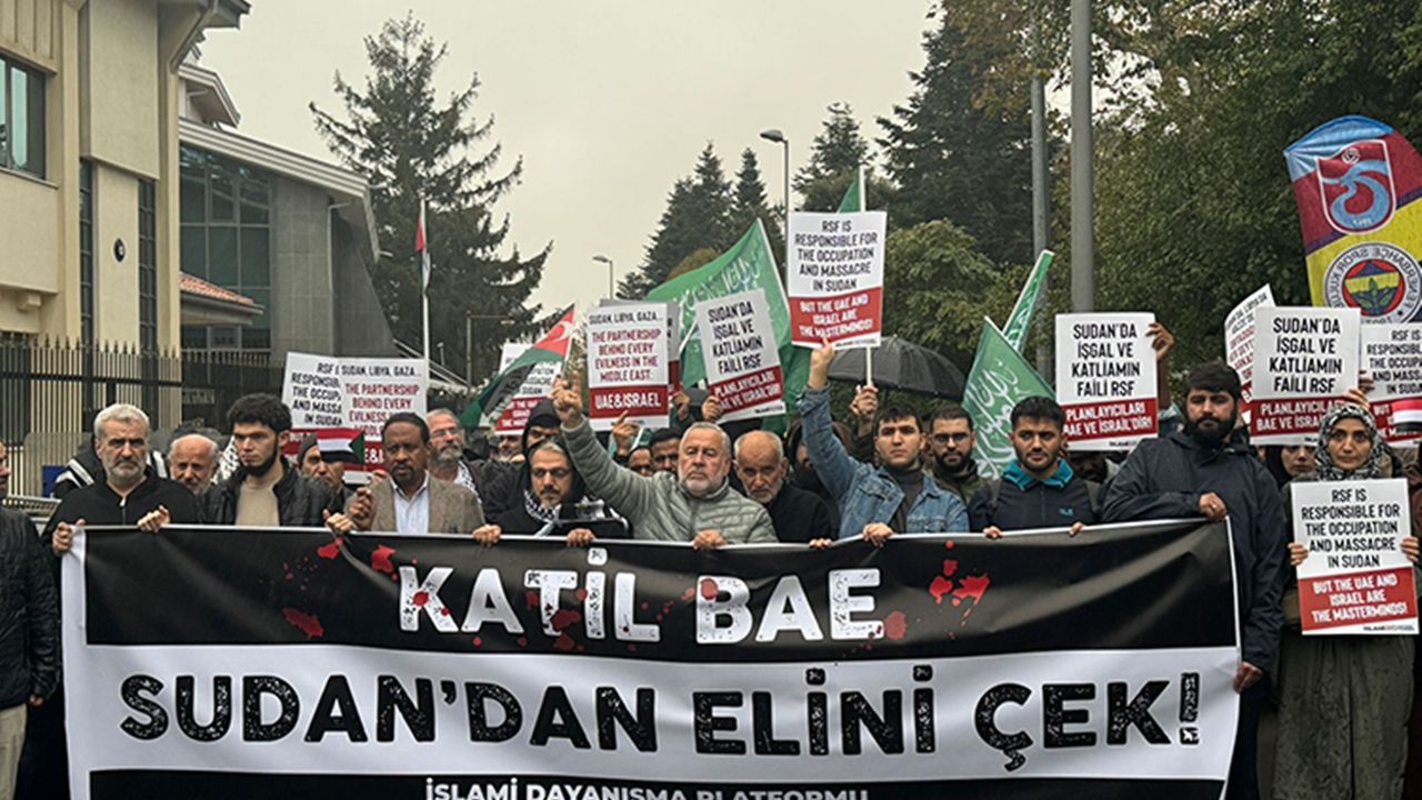 Beşiktaş'ta bulunan BAE konsolosluğu önünde toplanan grup, RSF ve Birleşik Arap Emirlikleri aleyhine sloganlar attı.