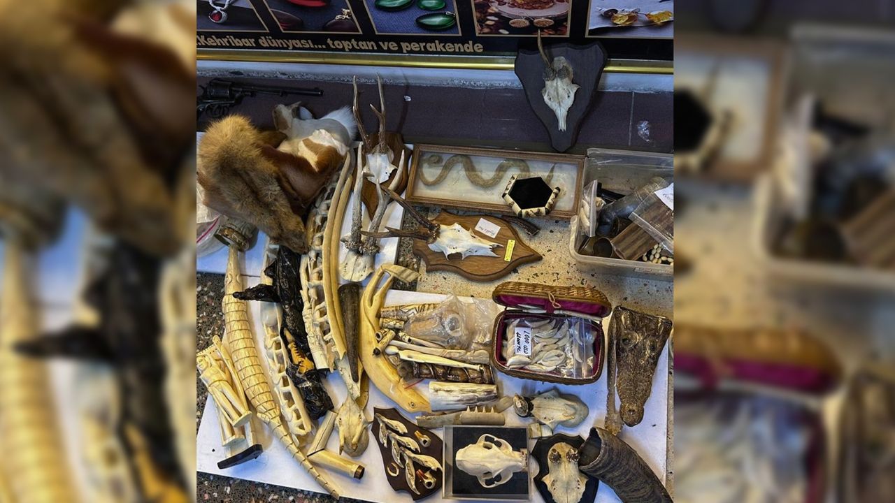 Yapılan denetimde ele geçirilenler arasında fil dişi tespihler, kurt dişleri, caretta caretta kabuğundan yapılmış tespihler, aslan tırnağı ve dekoratif objeler yer alırken, timsah derisi şapkalar, balina dişinden yapılmış tespihler, karaca trofeleri ve farklı türlere ait postlar da bulundu.