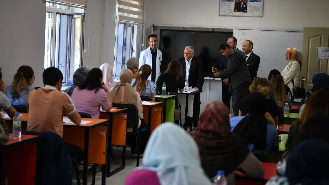 Kayseri Büyükşehir Belediye Başkanı Dr. Memduh Büyükkılıç, KAYMEK Sümer Tesisi’ni ziyaret ederek Akademi Giriş Sınavı (AGS) kursu öğrencileri ile bir araya geldi. Genç öğretmenlerle sıcak ve samimi sohbetler gerçekleştiren Başkan Büyükkılıç, sınava hazırlanan kursiyerlere AGS’de başarılar diledi.KAYSERİ (İGFA) - Başkan Dr. Memduh Büyükkılıç yönetimindeki Kayseri Büyükşehir Belediyesi’nin kentin adeta 6’ncı üniversitesi gibi eğitim ve kültür, sanat hizmeti sunan kuruluşu KAYMEK, zengin kurs içerikleri ile ücretsiz ve kaliteli hizmetini hız kesmeden sürdürürken Başkan Büyükkılıç da bu hizmetleri yakından takip ediyor.