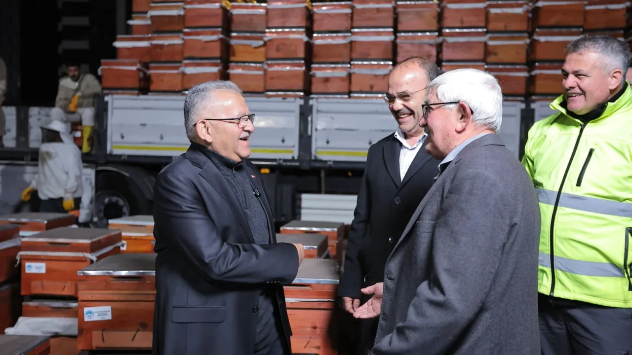 Kayseri Büyükşehir Belediyesi tarafından hayata geçirilen Kovan Sizden, Arı Bizden Projesi kapsamında kovan dağıtım programı, Büyükşehir Belediye Başkanı Dr. Memduh Büyükkılıç’ın katılımlarıyla sabaha karşı saat 04.00’da gerçekleşti. Arıların güneş ışığı görmeden sağlıklı bir şekilde hak sahiplerine dağıtılabilmesi amacıyla düzenlenen programa ilgi yoğun oldu.KAYSERİ (İGFA) - Tarım ve hayvancılık alanında Kayserili üreticinin kentteki en güçlü destekçisi olan Başkan. Dr. Memduh Büyükkılıç yönetimindeki Kayseri Büyükşehir Belediyesi’nin, kentte arıcılık ve arı ürünleri üretiminin gelişimini desteklemek, arıcılık sertifikası olan üretici ve üretici adaylarına ekonomik katkı sağlamak amacıyla hayata geçirdiği Kovan Sizden, Arı Bizden Projesi’nde kovanlar, üreticilere teslim edildi.