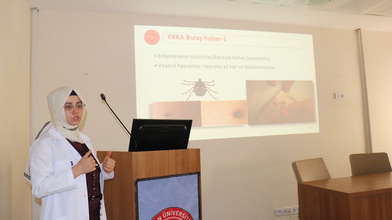Şanlıurfa Harran Üniversitesi Hastanesi’nde görevli sağlık personeline yönelik düzenlenen seminerde de KKKA’nın tanı ve tedavi süreciyle ilgili kapsamlı bilgiler paylaşıldı. Doç. Dr. Çakırca, özellikle doğayla temasın arttığı yaz dönemlerinde korunma tedbirlerinin ihmal edilmemesi gerektiğini vurguladı. Açık alanlarda bulunulduğunda kıyafet seçimine dikkat edilmesi, hayvanlarla temasta tedbirli olunması ve vücut kontrolünün ihmal edilmemesi gerektiğini hatırlattı.